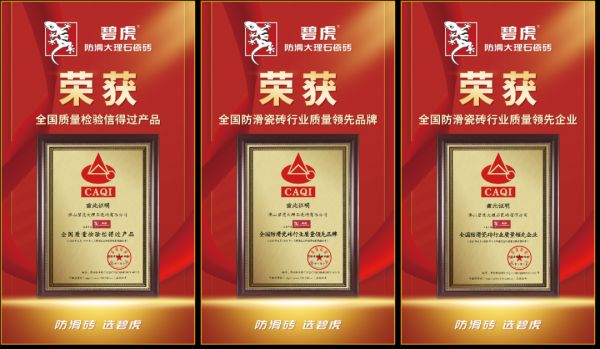 质量强则国家强,质量兴则民族兴。2023年7月,碧虎在“全国质量检验稳定合格产品”的调查汇总中,以超防滑核心科技和高质量的产品优势,从上千万家诚信企业中脱颖而出,赢得《全国质量检验信得过产品》、《全国防滑瓷砖行业质量领先企业》、《全国防滑瓷砖行业质量领先品牌》三座奖项,荣誉加冕,以质取胜。