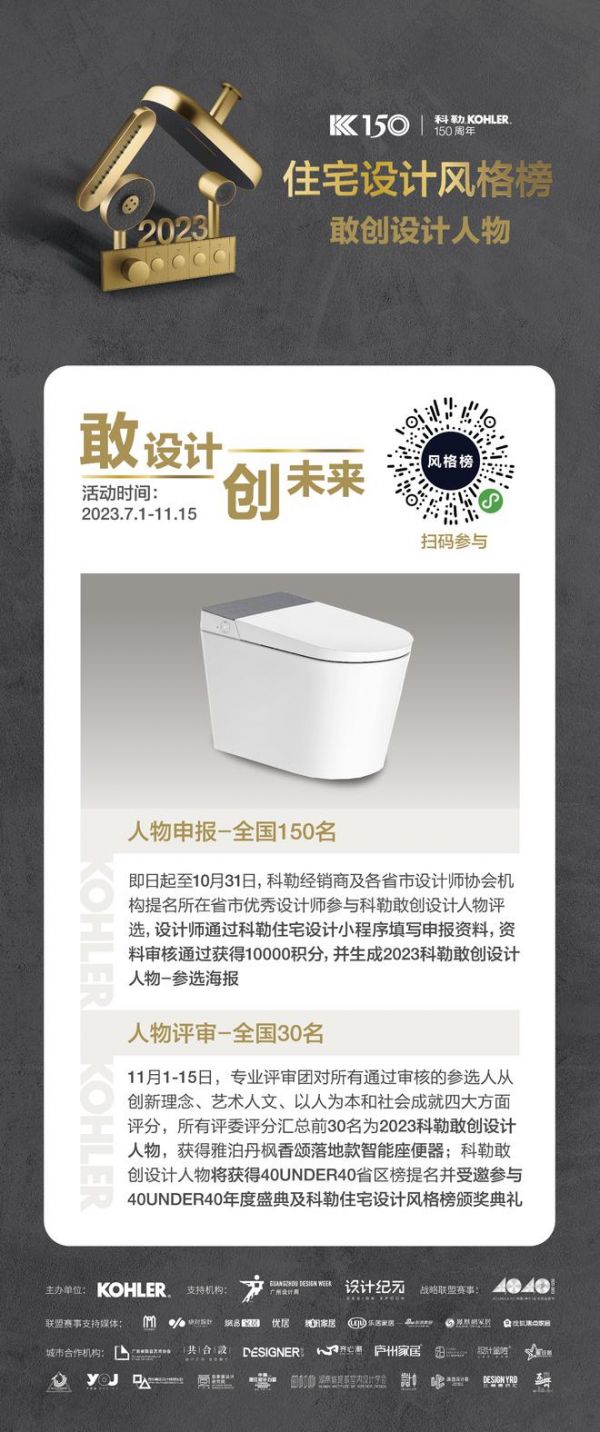 即日起至10月31日,科勒经销商及各省市设计师协会机构提名所在省市优秀设计师参与科勒敢创设计人物评选,设计师可以通过科勒住宅设计小程序填写申报资料;11月1-15日,专业评审团对所有通过审核的参选人从创新理念、艺术人文、以人为本和社会成就四大方面评分,所有评委评分汇总前30名为2023科勒敢创设计人物,获得科勒旗下雅泊丹枫落地式一体智能坐便器;科勒敢创设计人物将获得40UNDER40省区榜提名并受邀参与40UNDER40年度盛典及科勒住宅设计风格榜颁奖典礼;