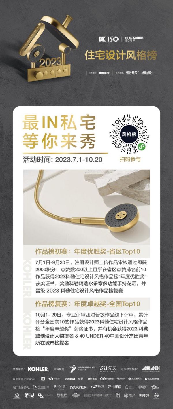 “2023年科勒住宅设计风格榜”将延续“线上初赛-线下复赛”的分阶段作品评选机制。线上初赛阶段(截至9月30日),线上点赞数省区TOP10作品获得“年度优胜作品”,并晋级2023住宅设计风格榜线下复赛;线下复赛阶段(截至10月20日),将根据设计大赛评委团累计评分全国前10名作品将获得“年度卓越奖”,并有机会获得2023科勒敢创设计人物提名& 40UNDER40中国设计杰出青年所在城市榜提名,助力新生设计力量成长。