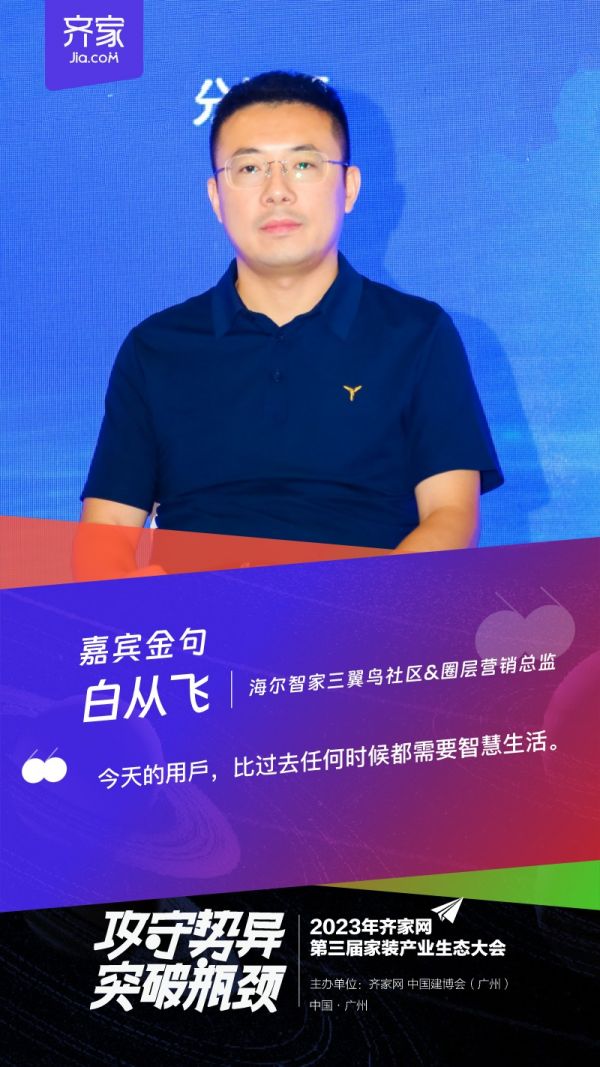 白从飞,海尔智家三翼鸟社区、圈层营销总监,多年来致力于为用户居家生活带来全新体验,对于智慧家装领域的发展有着自己独到的见解。海尔集团打造智慧家庭已经有17年的时间,对于用户需求的极致关注是品牌长久发展的不竭动力。三翼鸟作为海尔智家旗下全球首个场景品牌,集家电、家居、家生活为一体,为用户提供全场景生态解决方案,助力智慧家庭行业的革新,让智慧家庭能够走进千家万户。