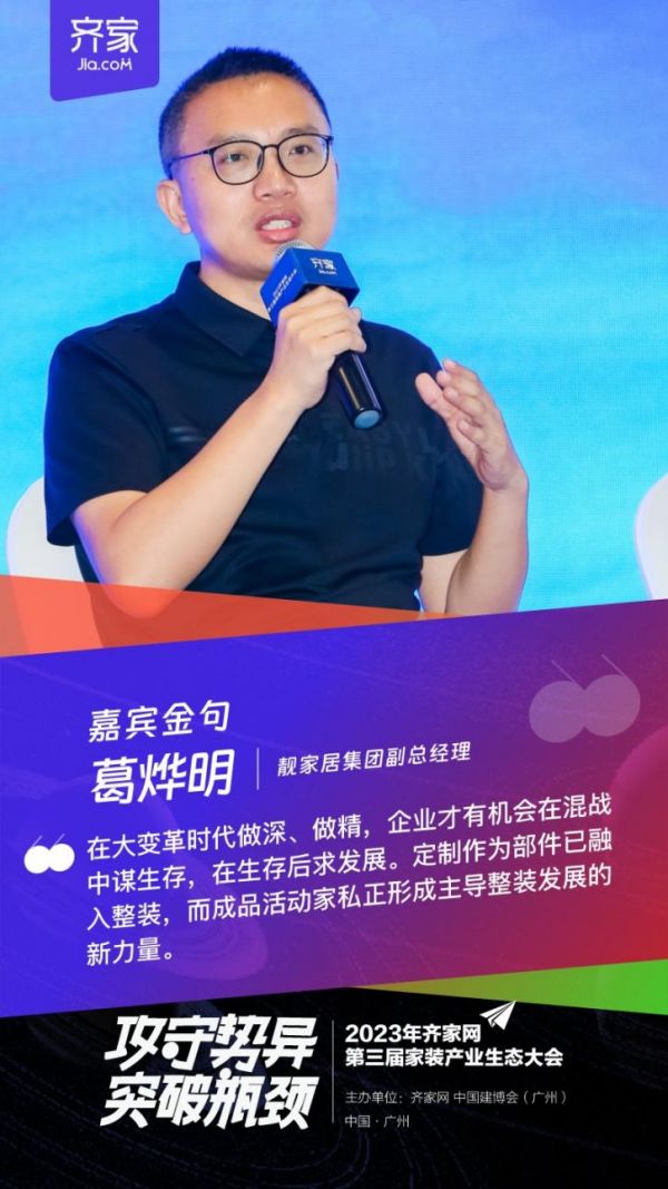 在圆桌论坛环节中,针对突围存量周期的话题,葛烨明基于对靓家居的经营经验分享了自身的观点意见。葛烨明认为企业应当距离用户需求更近,同时也应花更多的力气去研究和适应业主的需求变化,做到懂得用户所想。当前定制作为部件已融入整装,而成品活动家私正形成主导整装发展的新力量。他表示:“大变革时代企业必须不断做深、做专,不断贴近消费者需求,才能够有机会在混战之中生存,进而谋求新的发展。”
