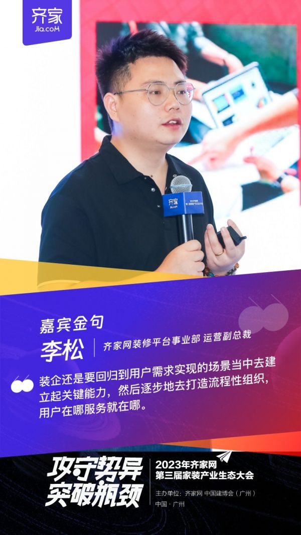 如何在低增长的背景下建立竞争能力,李松表示,“装企还是要回归到用户需求实现的场景当中去建立起关键能力,然后逐步地去打造流程性组织,用户在哪服务就在哪。”