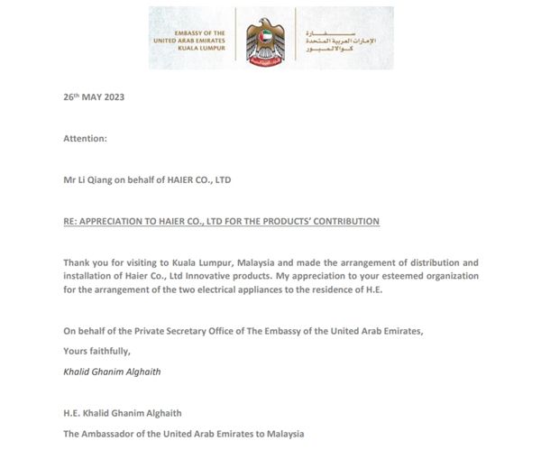 海尔马来西亚收到一封用户感谢信