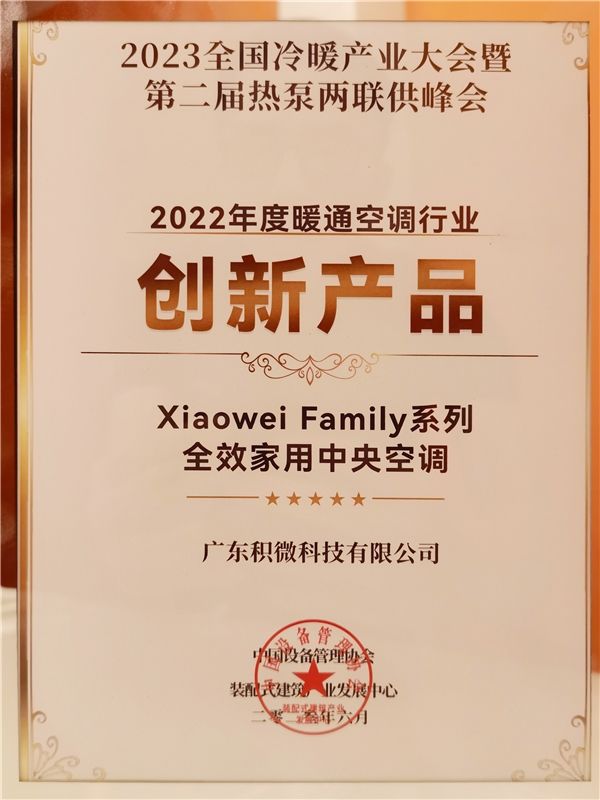 积微GCHV受邀参加了此次盛会,并携旗下家装旗舰产品——Xiaowei Family系列亮相峰会现场,向与会嘉宾展示舒适节能、绿色高效的家居冷暖系统解决方案。会上,积微GCHV凭借2022年度的优异表现荣获“暖通行业突出贡献品牌奖”,Xiaowei Family系列也荣获“创新产品奖”。