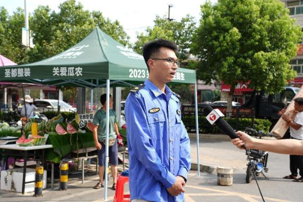 (瓜农瓜棚下卖瓜、采访城管工作人员的照片)
