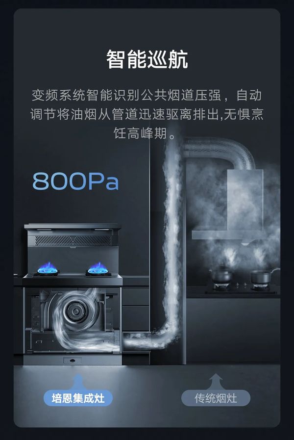 培恩E5系列集成灶搭载智慧变频控制系统,在烹饪高峰期,无惧高层烟道压力,最大800Pa静压值,智能识别公共烟道压强,自动续航增压,排烟顺畅,不倒灌,不跑烟。