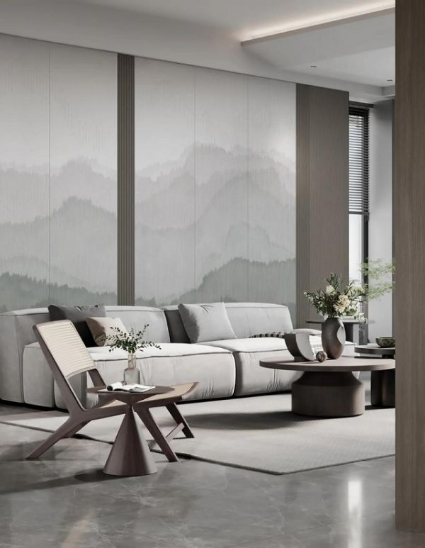 雅琪诺的这款产品《层峦Massifs》,犹如一副壮阔的水墨画卷徐徐展开,霎时间,层峦叠嶂尽收眼底,由近及远群山逐渐变得朦胧莫测,仿佛与天相接,使得整体空间显得开阔大气,面对这片连绵山峰,心中积郁一扫而空。同时又以写意山水的笔韵,通过山峦的层次变化与色彩的转换,呈现层林尽染的自然风光与悠远意境,表面的特殊笔触处理,又令其增添了一种朦胧美感,赋予了家居装饰更多的解读空间,构建了古韵悠然、饱含禅意的东方意境。