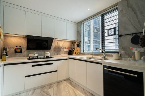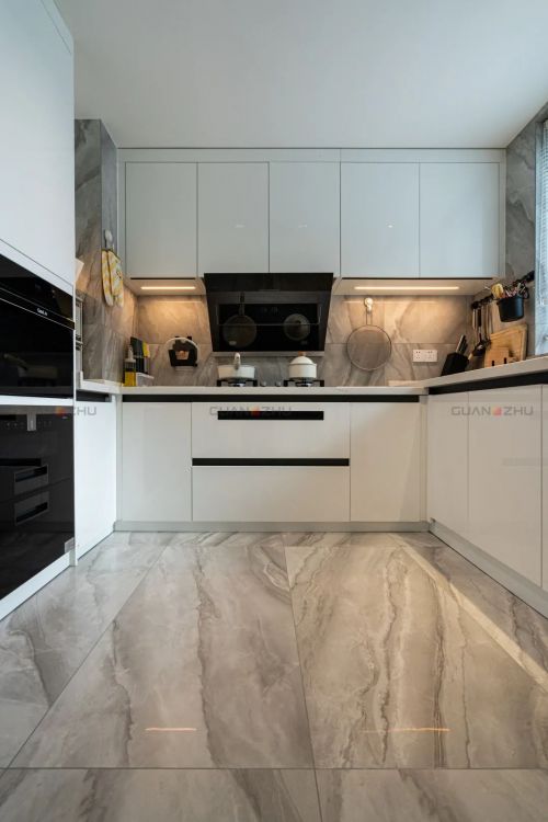 厨房采用经典黑白灰为基调,搭配亚马逊-深灰瓷砖,色调柔和细腻,纹理温润自然,简约中彰显质感。U型厨房布局,动线合理,柜台高度符合人体工程学,让下厨更方便舒适。