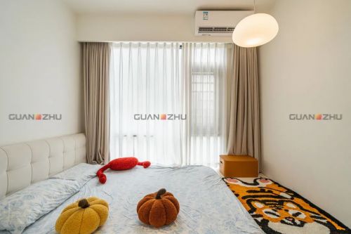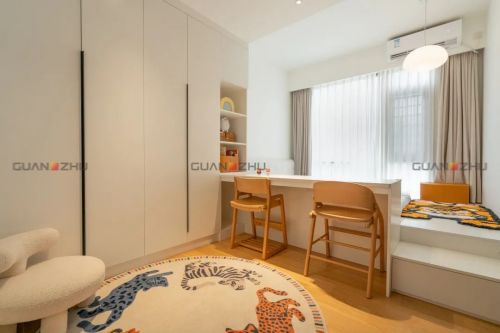 儿童房以烂漫天真的元素为主,整体空间采用柔和的杏色为主调,搭配鲜亮的橙黄色作为点缀。卧室地板延续客厅的原木风格,再铺上老虎卡通地毯,避免孩子们磕磕碰碰,各种多彩的异形玩偶增添童趣。