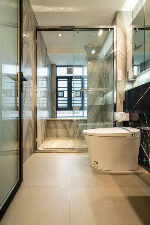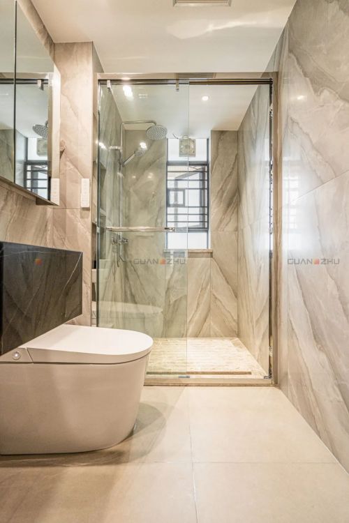 两个卫生间采用上浅下深的搭配方式,卫生间墙面瓷砖铺贴亚马逊-深灰瓷砖,地面瓷砖则铺贴冠珠定制米白色瓷砖,让整个空间显得更加稳重且有层次感。纹理丰富细腻的亚马逊-深灰瓷砖,打破卫浴间的单调,增添可观赏性;冠珠定制米白色瓷砖质优的防滑性能,能贴心保护家人们。