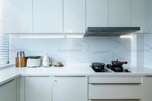 厨房是重油烟区,墙面瓷砖铺贴冠珠卡拉拉白瓷砖,搭配白色橱柜,打造干净清爽的空间,也便于日常清洁。上下柜结合设计,给厨房带来强大的收纳空间,保证厨房的整洁性,配合瓷砖的装饰,显得非常大方得体。