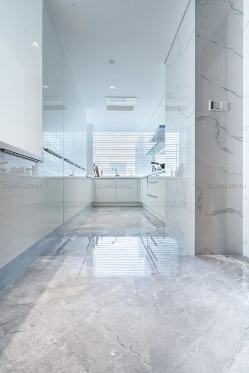 厨房墙面瓷砖铺贴自然气息感的鱼肚白岩板,搭配钢琴烤漆白色壁橱,时尚又敞亮,纯粹的简白色调传递着屋主追求纯粹、自由的生活方式。冠珠瓷砖除了高颜值的外观,更有硬核的物理性能,结构紧密,耐高温、易清洁,与重油污的厨房需求非常匹配,有了这样的厨房,做饭不是负担,更像是一种享受。