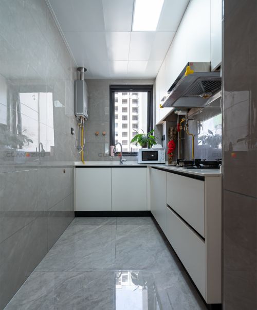 这款厨房比较紧凑,需要很好的规划才不会显得拥挤,整体采用纯白色橱柜、普佩斯浅灰墙面砖、卡瑟灰地面砖,浅色搭配扩大空间视觉效果。L型设计布局,动线合理,将空间最大化。厨房墙面选择强抗油污的灰色调瓷砖普佩斯浅灰、卡瑟灰,从美学与功能角度打造实用空间,烹饪后无需保养,轻轻一抹即敞亮干净,而且不易残留油污,让下厨变轻松,凸显生活精致又不远离烟火气。