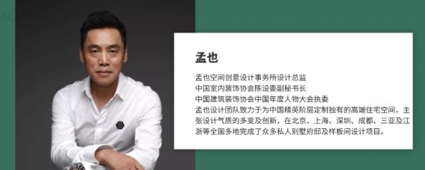 孟也 MENGYE国内空间设计师,孟也空间创意设计事务所设计总监、渡道国际空间(北京)设计创始人。是中国室内设计界领军人物之一,其作品在全国各地斩获空间大奖。