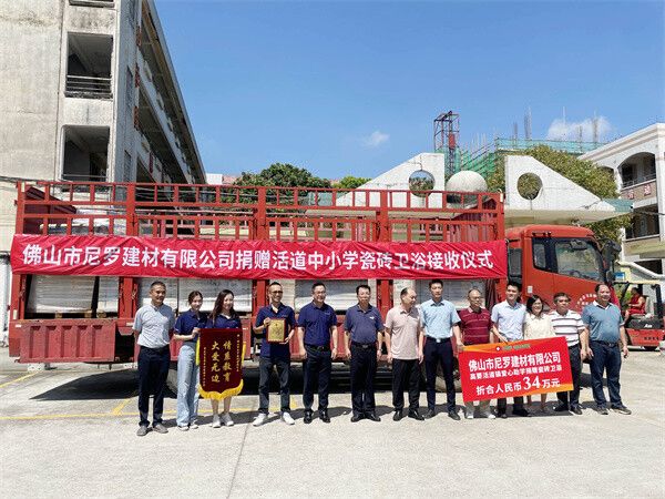 为改善学校的办学条件,给学生营造一个良好、安全的学习环境,佛山市尼罗建材有限公司高度重视,尼罗格兰陶瓷中国&印度公司总裁黄清国先生对本项目大力支持,为该项目进行定向捐赠,持续为社会发展贡献尼罗力量!此次尼罗格兰陶瓷积极履行社会责任向当地捐赠总价值约34万元的西班牙进口瓷砖与卫浴产品,为改善活道镇中小学校园环境添砖加瓦。