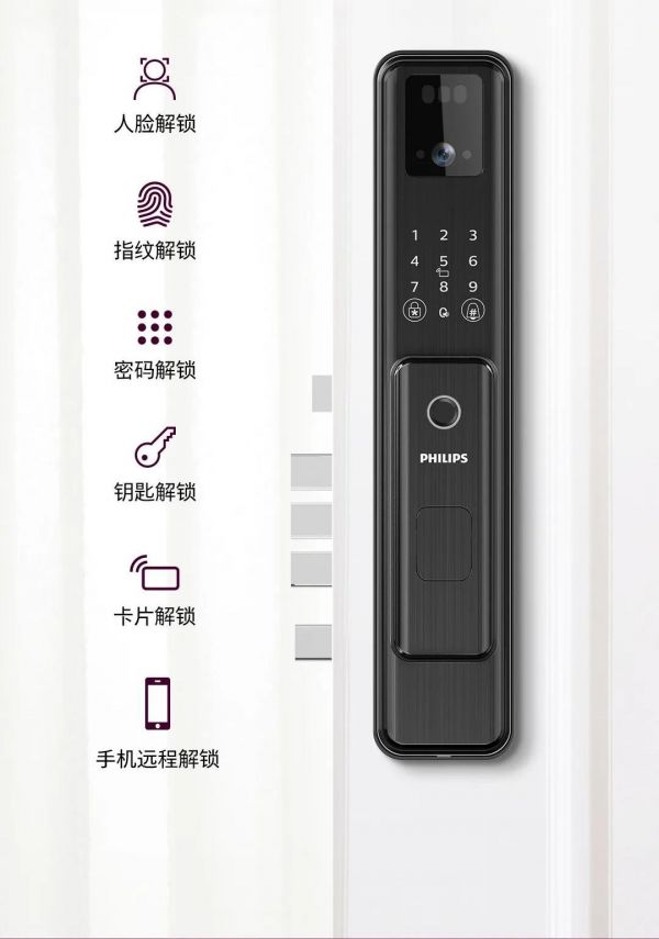 在室外解锁方式上,飞利浦智能锁DDL301-FVP提供了人脸、指纹、密码、微信小程序、卡片、钥匙等6种解锁方式。诚然,解锁方式多寡不是衡量智能锁好赖的最关键因素,但基于现阶段我国大部分中国家庭依旧属于老中青三代共处一室的生活模式这一现实情况,多样化的解锁方式彰显着品牌对于消费者需求的重视与满足。