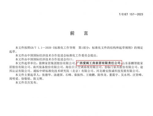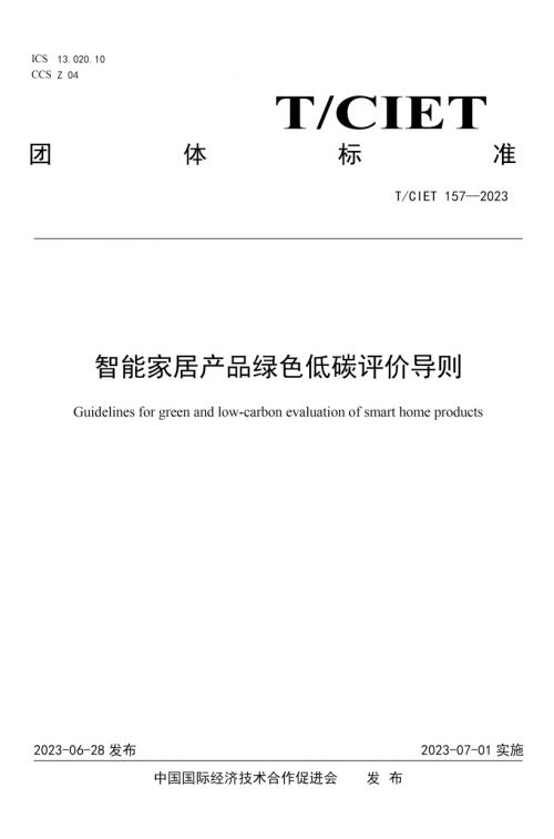 由中国国际经济技术合作促进会标准化工作委员会提出,联合爱阁工房、喜临门等众多优秀企业,按照GB/T1.1—2020《标准化工作导则第1部分:标准化文件的结构和起草规则》规定编制的T/CIET157—2023《智能家居产品绿色低碳评价导则》团体标准于2023年07月01日正式实施。