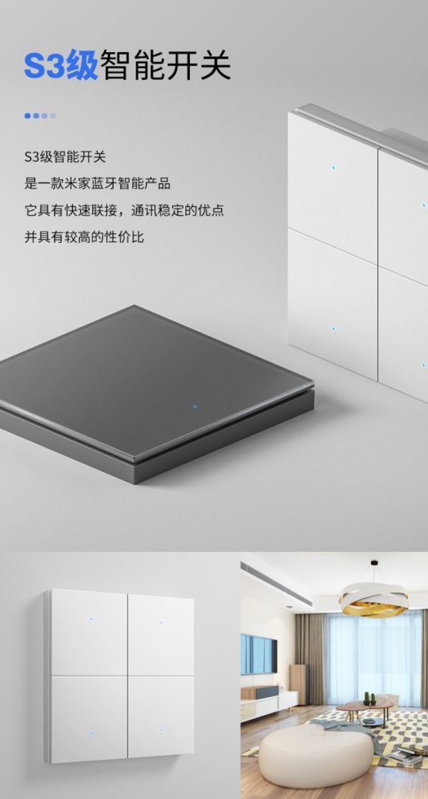 米家蓝牙版智能开关,其主要的特征之一为:性价比高。它不仅能够快速联接,通讯稳定,而且价格比较实惠。比如一位智能开关价格仅为两百多元,而四位智能开关仅为三百多元。