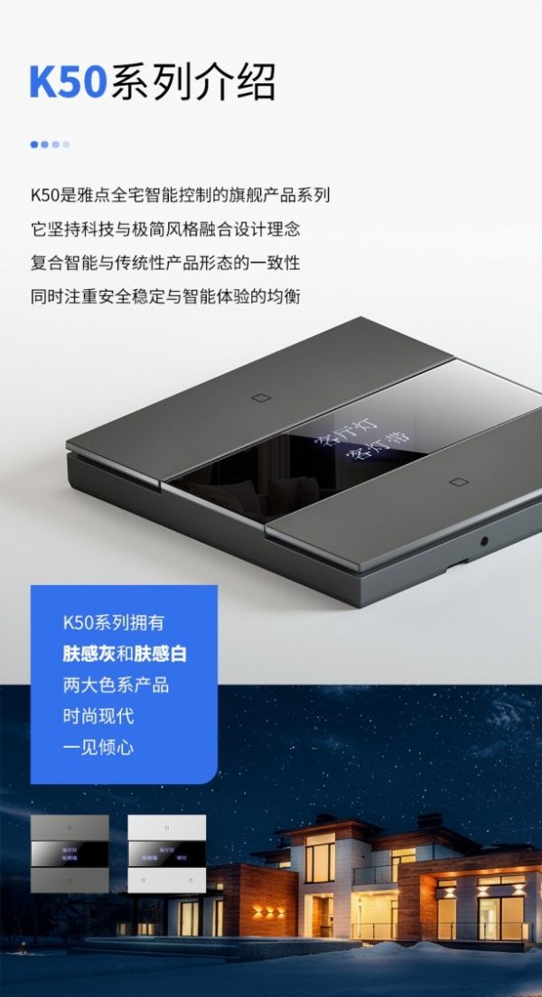 雅点K50系列智能开关,不仅设计别出心裁,而且功能特色多,档次高,性能稳定。它是高档别墅、酒店、宾馆等场合装修的理想选择。
