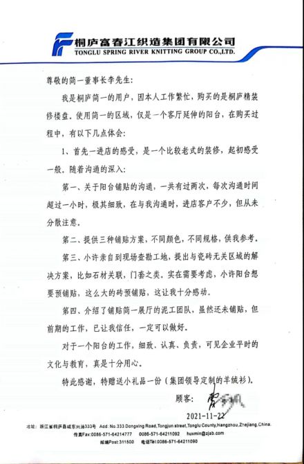 一封封表扬信、一面面锦旗、一次次为简一活动站台……这些不同形式的感谢方式,都是消费者对简一服务的认可,也是简一持续做好用户服务的动力。在简一看来,用户不仅仅是产品和服务的体验者,更是品牌难得的挚友,简一希望通过服务好用户的美好家建设,建立更深层次的情感链接,相互成就,实现共赢。因此,你会看到在业主群,用户对简一服务真诚的点赞;在活动现场,简一挚友向更多消费者推荐简一。以真诚为宗旨,以真心换真心,简一与用户共情共鸣。