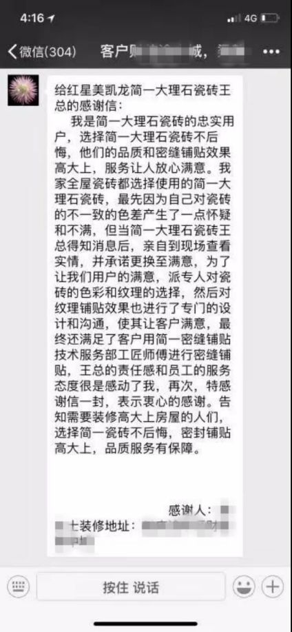 把复杂留给自己,把简单留给用户。在对待消费者上,简一讲究的是真诚,用真心换真心,把客户的房子当成自己的房子来看待,也正是在用户服务上的孜孜以求,简一不断收获来自用户的认可与好评,一封封饱含真情的表扬信切实体现出了客户服务的真谛——“你为所做的,用户都会看在眼里、记在心里”。正如简一挚友,目前国内登顶珠峰最年长女性陈旻在采访中所言:“简一的产品温度不是触摸到的物理温度,而是精神归宿和人文情怀,瓷砖里面承载简一的匠心与温度。”