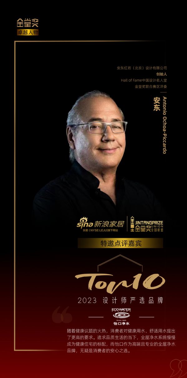 安东红坊(北京) 设计有限公司创始人、Hall of Fame中国设计名人堂、金堂奖联合赛区评委 安东(Antonio Ochoa-Piccardc)对怡口净水上榜表示祝贺,并点评道:随着健康议题的火热,消费者对健康用水、舒适用水提出了更高的要求。追求品质生活的当下,全屋净水系统慢慢成为健康住宅的标配,而怡口作为高端且专业的全屋净水品牌,无疑是消费者的安心之选。