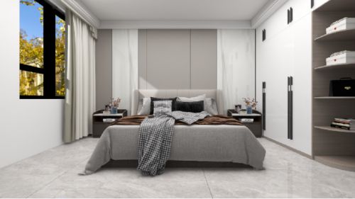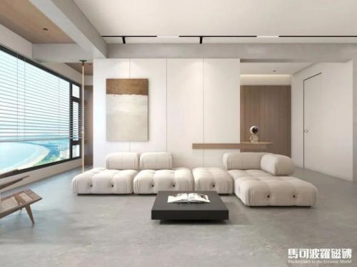 而像卧室这样的休息空间,地面可选择铺贴马可波罗月光石,这款大板瓷砖表面为灰色纹理,浅色系的底色仿佛姣月光一般倾泻而下,温柔内敛,烘托出一种自然舒适的氛围,可以引导人们在空间中更好地放松身心。