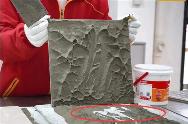 如只在基面上浆,尽管瓷砖胶与基面接触良好,但与砖背的接触往往较差,从下图可看到,砖背是不满浆。
