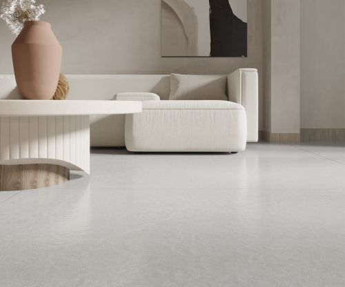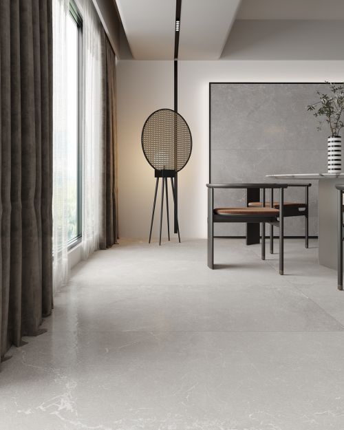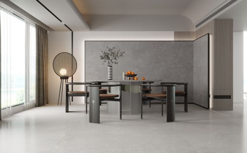 这一系列的瓷砖产品以阿马仕灰石材纹路与人文水泥的质感轻纹理为特点,纹理与底色明亮度之间的差异不超过21阶,形成了“三米之外远看是纯色,近看有丰富细节”的独特特点,降低了纹理对视觉的冲击。而且,砖与砖之间自然连纹,整体铺贴简洁素雅,为空间提供了更大的留白,减少了空间的杂乱感,为家居打造出最理想的空间背景。