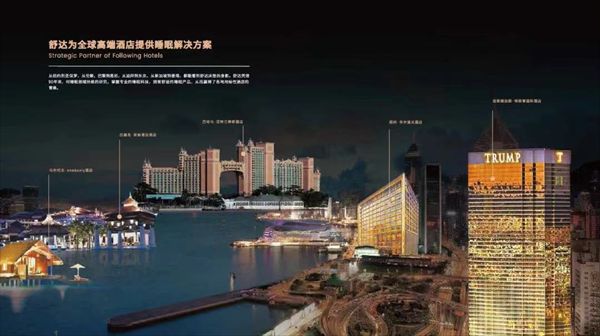 作为全球性高端床垫品牌,舒达床垫为全球范围内的万豪、洲际、华尔道夫、英迪格、温德姆、希尔顿、喜来登等高端酒店提供高质量睡眠产品。三大国际酒店集团:希尔顿酒店集团、万豪酒店集团、洲际酒店集团,都是舒达长期战略合作伙伴。