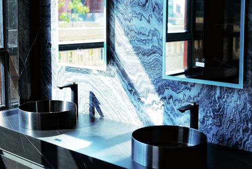 在3楼主卧浴室中,设计师根据孙一文的身高及生活习惯,量身定制了一款近两米长的黑棕色轻奢风浴室柜。黑色简约的双台盆满足了孙一文想要与家人一起洗漱的愿望,黑白根岩板台面、黑棕色的瓦楞纹细节格栅门板与黑金撞色超薄方形轻奢龙头搭配,利落流畅的边框设计工艺,细节满满,呈现出既高级又有质感的审美,塑造出享受放松的美学空间,唤醒一天的美好心情。