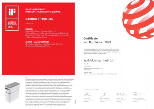 2023年,意可可创新研发的“壁挂垃圾桶”和“窄型垃圾桶”更是相继获得了国际公认的权威设计大奖——红点设计奖和德国IF奖,充分展现了意可可研发团队原创设计能力及国际专业化的一线设计水平。