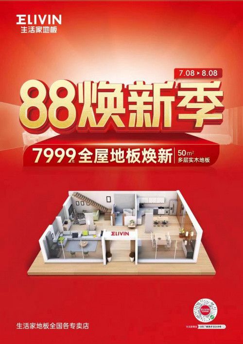 “应援”家居焕新,助力更多追求品质家居生活的消费朋友打造高颜值有品质的新家,生活家地板也特别推出“8·8焕新季”全国活动,加大地板优惠力度,点燃家居焕新狂欢。