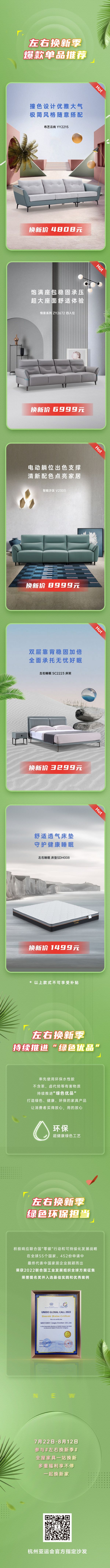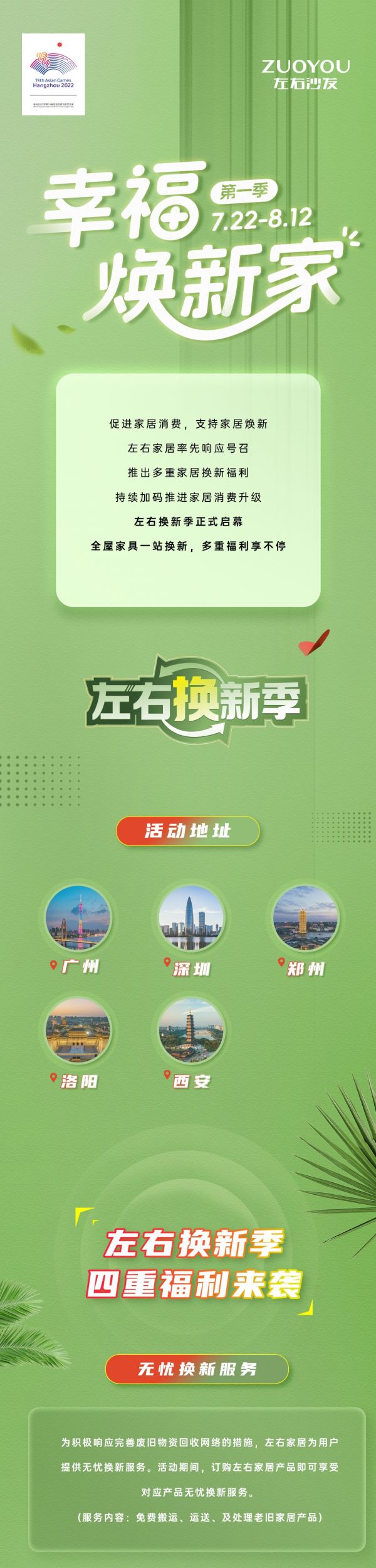 7.22-8.12,左右家居发起第一季“左右换新季 · 幸福焕新家”活动,在广州、深圳、郑州、洛阳、西安五大城市,推出四重换新福利,更有爆款产品换新价,多方面支持用户更换和购买绿色家居产品,低碳环保焕新家,为用户带去更绿色、便捷的一站式家居购物新体验。