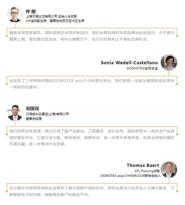 本届DOMOTEX asia国内外展商全面回归,汇集必美,乐迈, Bauwerk,Valinge,朗穆,百玛家居,艾瑞地亚,德尔,安派森,大自然,天格,兔宝宝,安信,富得利,地王,美术家、圣象、盟多、大巨龙、北新、丽杰、高科、晶通、爱丽、华丽、肯帝亚、海利得、易华润东、正永、美高美、永裕、劲嘉、实德、伟康、i4F, UNILIN, KDF, DAEJIN, 森泰、美新、共创、青禾、泰山、英利奥、海马,瑞鑫,加鼎,东升,奥飞斯,开利,东方,鸿成,港龙,优立,欧罗家居,鸿佳,琅美,星月,山花,诺奥,浩普,华腾,洁仕特,雅洁,喜马拉雅,圣源,美艺,新宜家,爱德,天瑞,雅瑞,艺科美,霖坤红源,华新 ,家禾瑞宝,FREUDENBERG,ATMAX,Zimmer,Stäubli,Sellers,Power-Heat-Set,Owenscorning,Truetzschler, Groz,Unitika,KOLON,AKIJ,Ornek,MIC,EOC, HANIL,帝龙,汇美,大正,恒兴,邦弗特,爱克太尔,ADESIV, CIRANOVA,WOCA, STAUF, Chimiver, BONA, 英科,HOMAG,三益,博宇,鑫奇航,帝翔,安住,豪特景,盈天,欧西克,嘉好,汉拓,美嘉,通印,希望数码,精陶,efi, 普瑞特,博硕等国内外全产业链知名品牌悉数到场,携新品首发与前沿技术汇集于此,共同开启建装圈年度盛会!(以上排名不分先后)