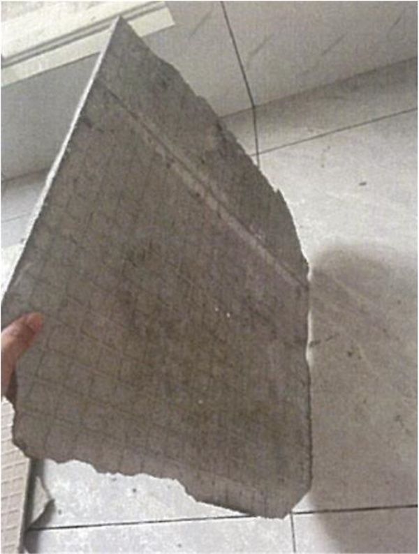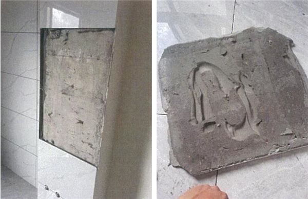 我们拆除空鼓瓷砖后,发现背胶层出现自身分离,即瓷砖、背胶层、胶块之间出现分离脱落,胶块与墙面基层分离脱落。
