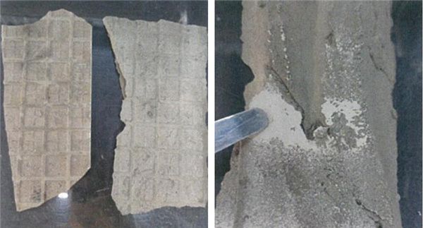 部分胶块背面粘有腻子层材料。腻子层材料作为墙面基层,无法满足后续瓷砖粘贴的要求,不适合施工防水层或铺贴瓷砖。