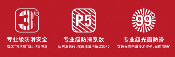 因为专业,所以值得信赖。为了做人民满意的防滑砖,碧虎始终坚持三个专业:专业级防滑安全、专业级防滑系数、专业级光面防滑。同时,碧虎第二代G5超防滑多功能瓷砖不只是超防滑,防污能力达到5级,耐磨性能达到4级以上,兼具有超防滑、超耐污、超耐磨、超细腻、耐酸碱等优点,能够全方位解决用户烦恼。