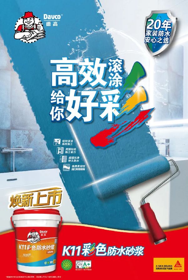 对于墙面贴砖,使用偏刚性的水泥基防水浆料(如德高K11彩色防水砂浆),其涂层粗糙,拉毛效果明显,这能使后续的贴砖更加牢固。
