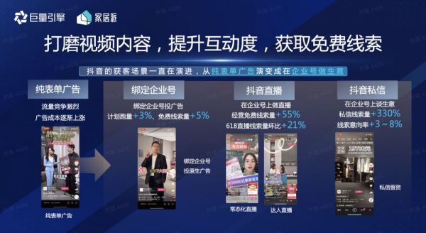 从数据上看,家居在抖音平台上的生态繁荣,用户人群庞大,粘性也在持续走高。对于装企来说,找对投放策略、输出有看点的内容、用内容拿线索,就会有更好的获客机会。