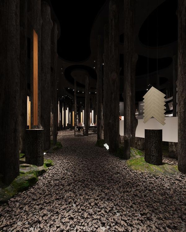 同时,展馆的设计并非是寻常展览的简单陈列,而是将原木与产品错杂地融入原始森林的环境中。相较于直接地宣传,场景化的打造能充分调动观展者的情绪,让其自主地追寻产品的源头,在这种追根溯源的过程中,体会到Der·1863的选材的用心以及自然的魅力。