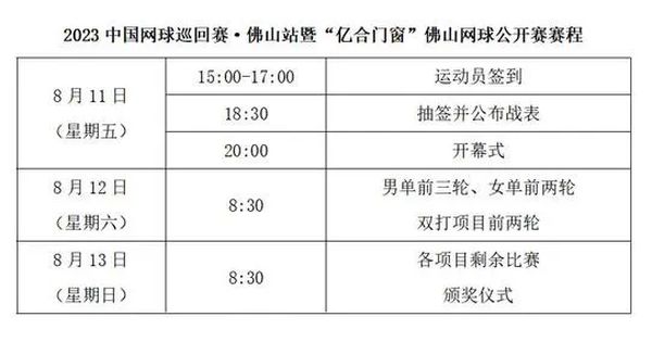 按照赛程,8月11日进行运动员抽签并公布战表,次日进行男单前三轮、女单前两轮、双打项目前两轮,13日进行各项目剩余比赛并颁布最终赛果。日前,佛山站赛事的指定报名渠道已于中国网球巡回赛官方网站开启,欢迎广大网球爱好者踊跃报名。今年佛山站的比赛,预计将有来自全国各地的200余名网球运动员参赛,比赛设置了男/女单打、男/女双打和混双五个组别,运动员奖金总额为30万元人民币。