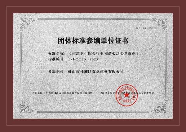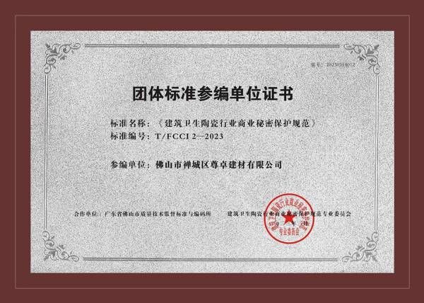 以上行业团体标准均为各自领域全国首个,尊卓陶瓷作为参编单位,荣获相关单位证书。