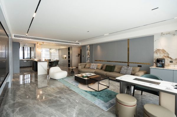 客厅的电视背景墙采用灰色的收纳墙,与整体布局形成统一风格,旁边用大理石作为点缀,各式各样的布艺、金属元素及大理石等材料将多元化肌理呈现出来,在现代元素十足的空间里,衍生出自然美感。