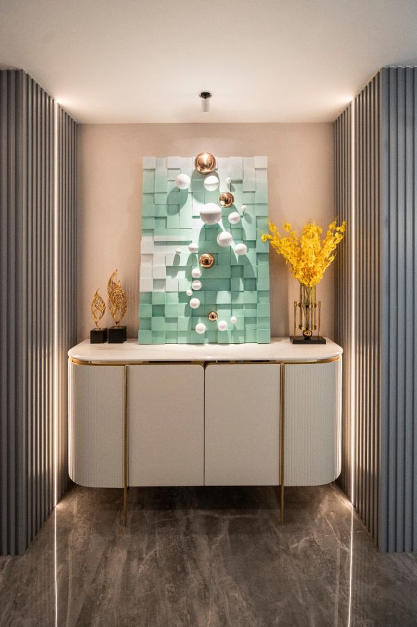 玄关处一进门就是蓝白相间的定制墙布的背景,显得十分大气典雅,好似一副水墨画映入眼帘。再搭配白色的收纳桌和艺术装饰画,现代与古典的结合,让美学更加立体。