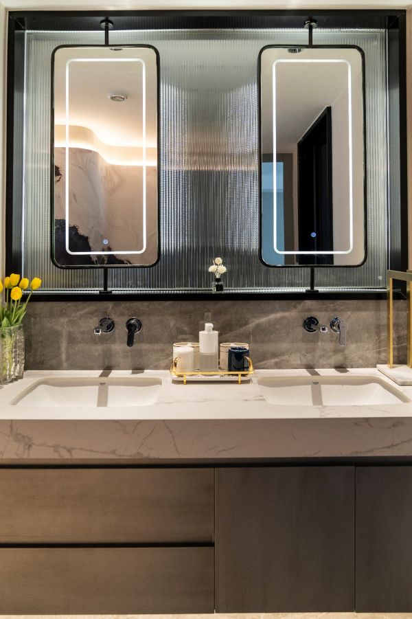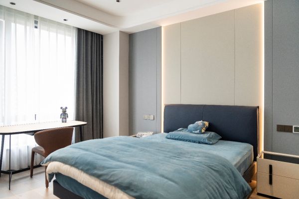 主卧看似简约大气,其实暗含了很多精致的设计,倒立的L型梳妆台其实有很多抽屉,可以容纳女主人很多化妆品,精致又实用。干净简洁的空间,让人放下疲惫,进入舒适的安逸时光。儿子房采用蓝色调,整体风格活泼明朗,以此凸显出孩童纯真的个性和美好向往。女儿房采用浅粉色为主调,加上玩偶的配饰,氛围感十足。满足女生的梦幻公主梦。父母房的风格比较素雅简约,褪去鲜明的个性,变得更为平和,温润,符合父母这一辈的调性。外卫设计了双洗手台,非常符合现代人的生活需求,让本就匆忙的早晨变得井然有序。