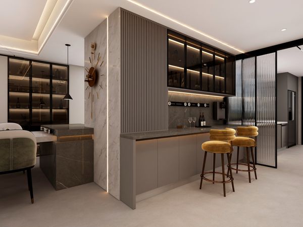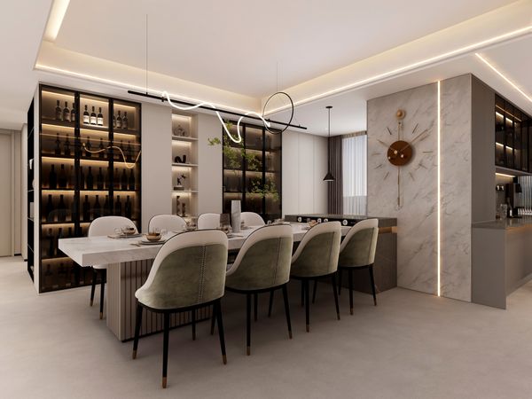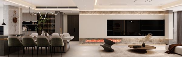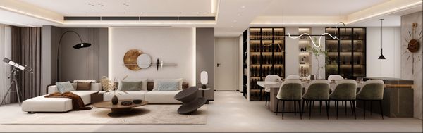 客餐厅用简单的线条做整体构成,颜色简约却不单一,墙地用大面岩板,突显整体效果。