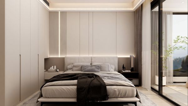 主卧大幅玻璃增强采光和通透性,玄关造型处理让室内卧室空间与外部动态空间相互连贯。