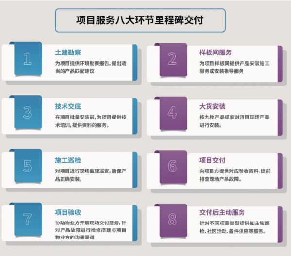 强大的供应链是企业硬实力的表现,而完善的服务体系则体现的是企业的软实力,尤其对于产业链涉及环节众多的地产业来说,完善的服务体系是住房品质和按时交房的最基本保障。九牧秉持“以客户体验为中心”的服务理念,推出“商用无忧交付服务”工程一站式服务解决方案,包括从土建勘察、样板间服务、技术交底、大货安装、施工巡检、项目交付、项目验收到交付后主动服务建立起全流程跟踪服务体系。
