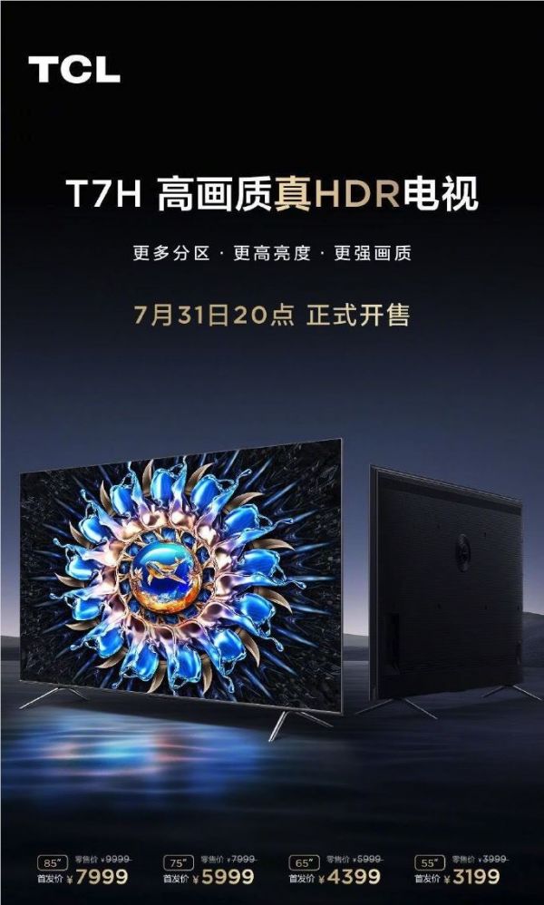7 月 31 日,TCL官方宣布T7H高画质真HDR电视正式开售,首发价3199~ 7999 元,其中 55 英寸 3199 元、 65 英寸 4399 元、 75 英寸5999元、 85 英寸 7999 元。凭借高峰值亮度和高分区数等配置,TCLT7H一经上市,便被誉为行业的真HDR电视标准。